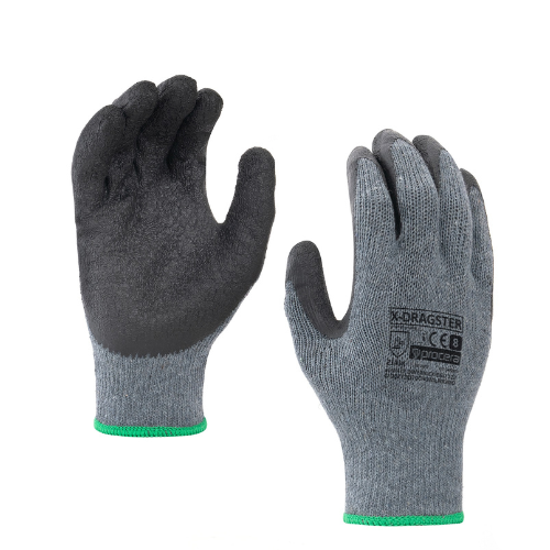 Minimální odběr 24 párů. Rukavice X-DRAGSTER jsou vyrobeny z pletené polyesterové bavlny, šedé barvy, potažené v oblasti úchopu latexem s hrubou strukturou. Velmi dobrá přilnavost. Zakončeno lemem. CE EN 388. Balení: karton 24/120. Barva: šedá / černá.