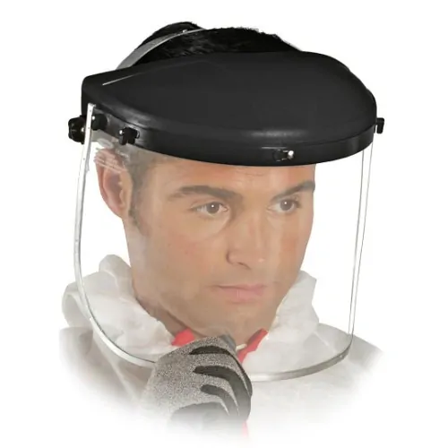 Obličejový štít skládající se z čočky proti rozstřiku, pokrývky hlavy a sestavy závěsu.optická třída 1polykarbonátové sklomožnost zvednutí kryturozměry: výška 203 mm, šířka 394 mm, tloušťka 1 mmpanty umožňují správné umístění skla vzhledem k obličejimožnost přizpůsobení pokrývky hlavy obvodu hlavych... celý popis